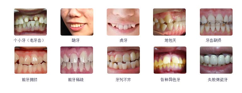 中国人常见的口腔问题是暴牙、虎牙、老鼠牙(个小牙)、地包天、前牙拥挤、前牙稀疏、牙列不齐、牙齿缺损、烤瓷失败、错过矫正黄金期的成年人以及重度四环素牙等。而不断加快的生活节奏又让大家几乎没有时间走进牙科医院进行必要的定期口腔护理,很多小问题就变成了大问题,牙齿也跟美丽说拜拜。